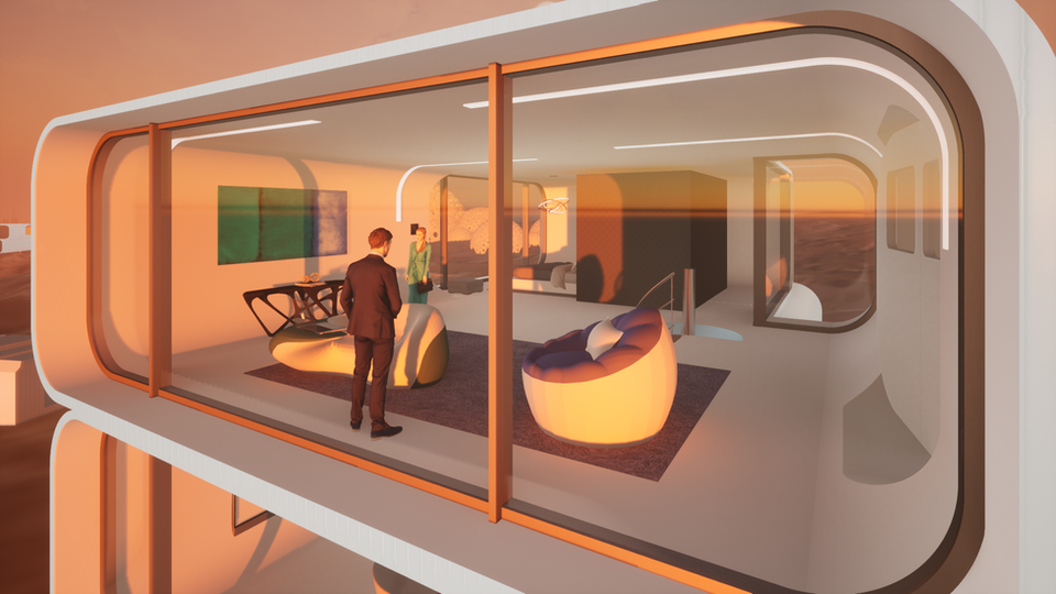 Enjoy the finest earthly luxuries, 300 million kilometers away from everything you've ever known, with Agusto AO97 – Mars’ premier vacation resort and spa. Travel beyond the earth’s gravitational pull to a world of unprecedented luxury, immersive technology, and, on a clear day, unbeatable views of the solar system.